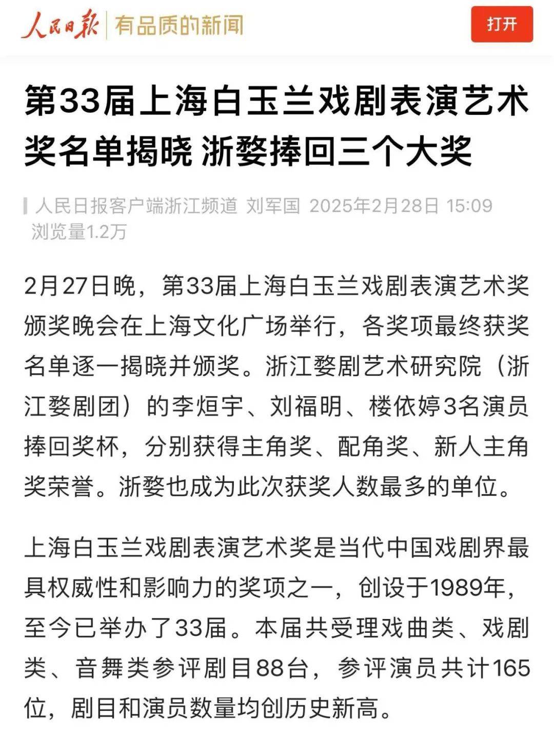 2月28日,客户端推送《第33届上海白玉兰戏剧表演艺术名单揭晓 浙婺捧回三个大》,关心第33届上海白玉兰戏剧表演艺术名单揭晓,浙江婺剧艺术研究院的李烜宇、刘福明、楼依婷3名演员别离获得配角、副角、新人配角荣誉。浙婺也成为此次获人数最多的单元。
